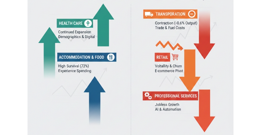 While certain essential service sectors (Health Care, Accommodation & Food) are growing or stabilizing, others — particularly Transportation, Retail, and Professional Services — are showing signs of contraction or volatility.
